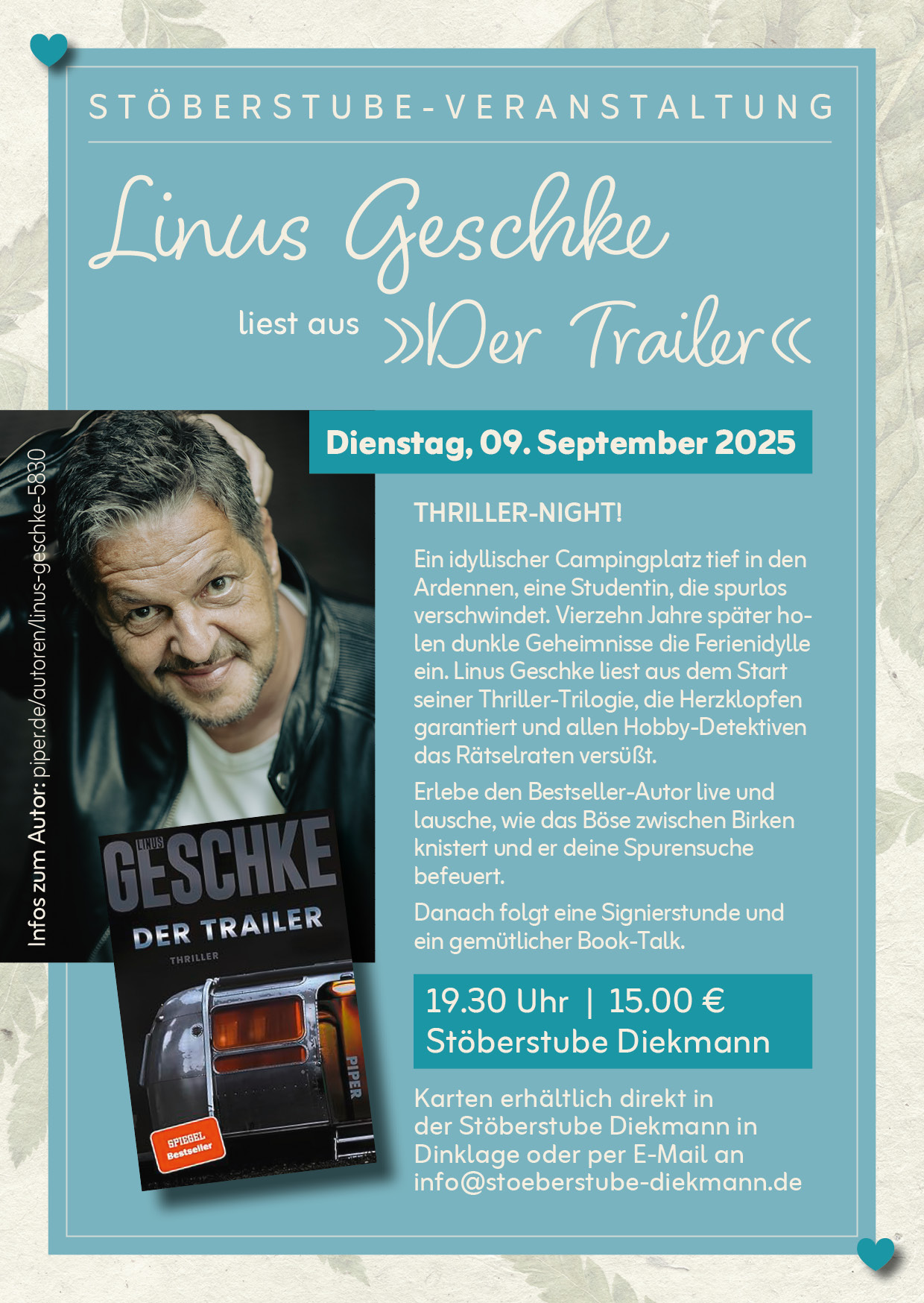Kulinarische Lesung 2026 Februar 9, 2026 Zwei Abende voller Atmosphäre, Literatur und kulinarischer Genüsse liegen hinter der Stöberstube Diekmann. Am 9. und […]